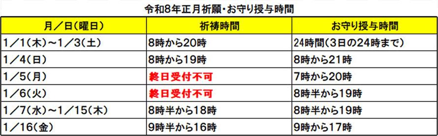 元日1/1(木)から小正月の1/15(木)までの期間は家内安全、厄祓い、合格、交通安全など、全ての願意を込めた1年のうちにこの期間でしか受けることが出来ない新年特別祈願でのご奉仕となります。個別の願意(お願い事)でのご奉仕は16日(金)以降となります。